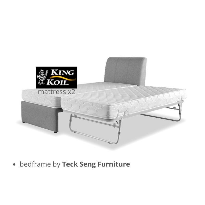 Home Bedroom Bed Frame King Koil Super Single with pull out single bed frame. 3Pull Out Mattress 91cm x190cm x 15cm 6inches 4Headboard H108cm x W91cm x T10cm. High Resilient Super Soft Polythylene Foam.